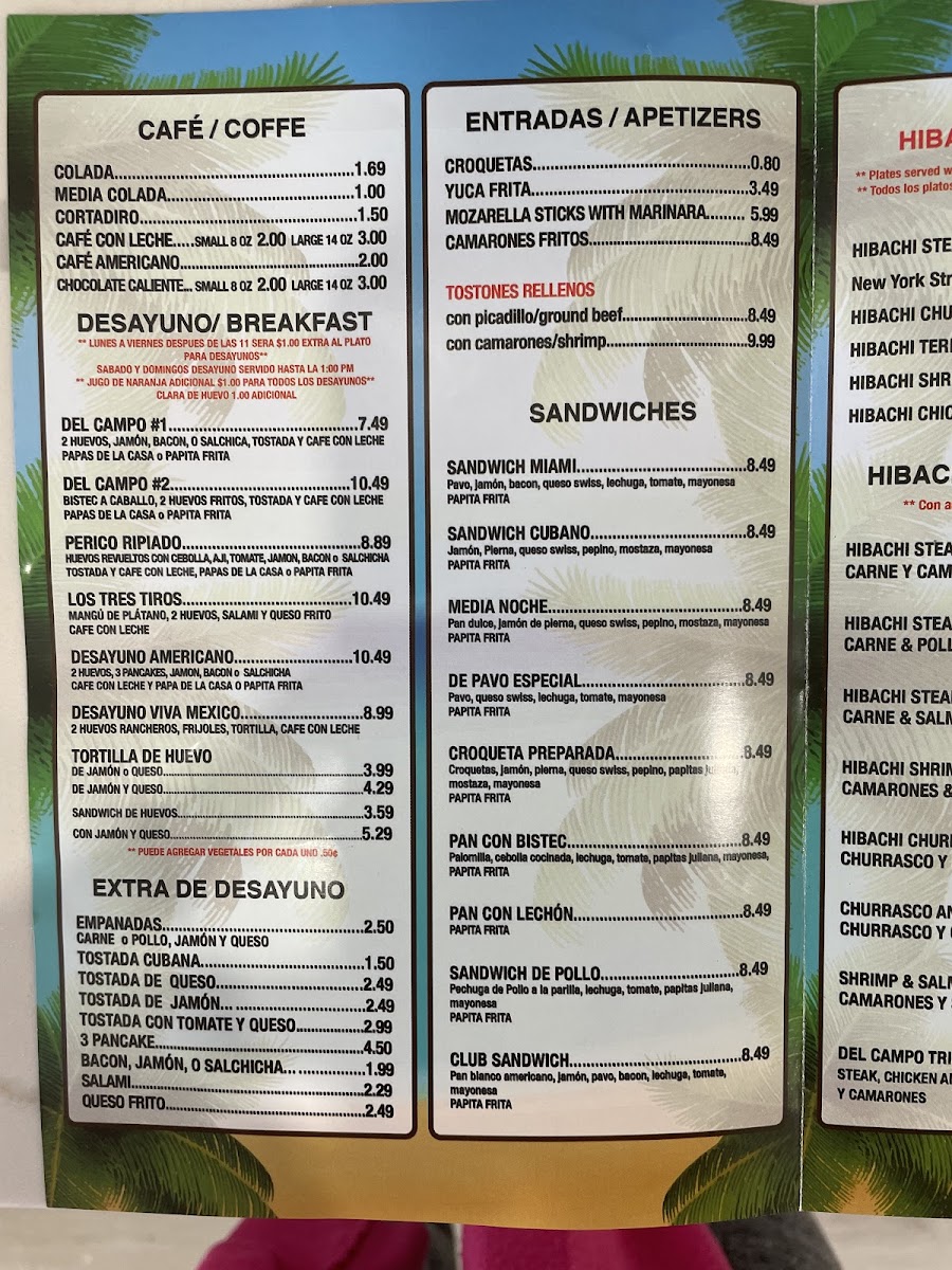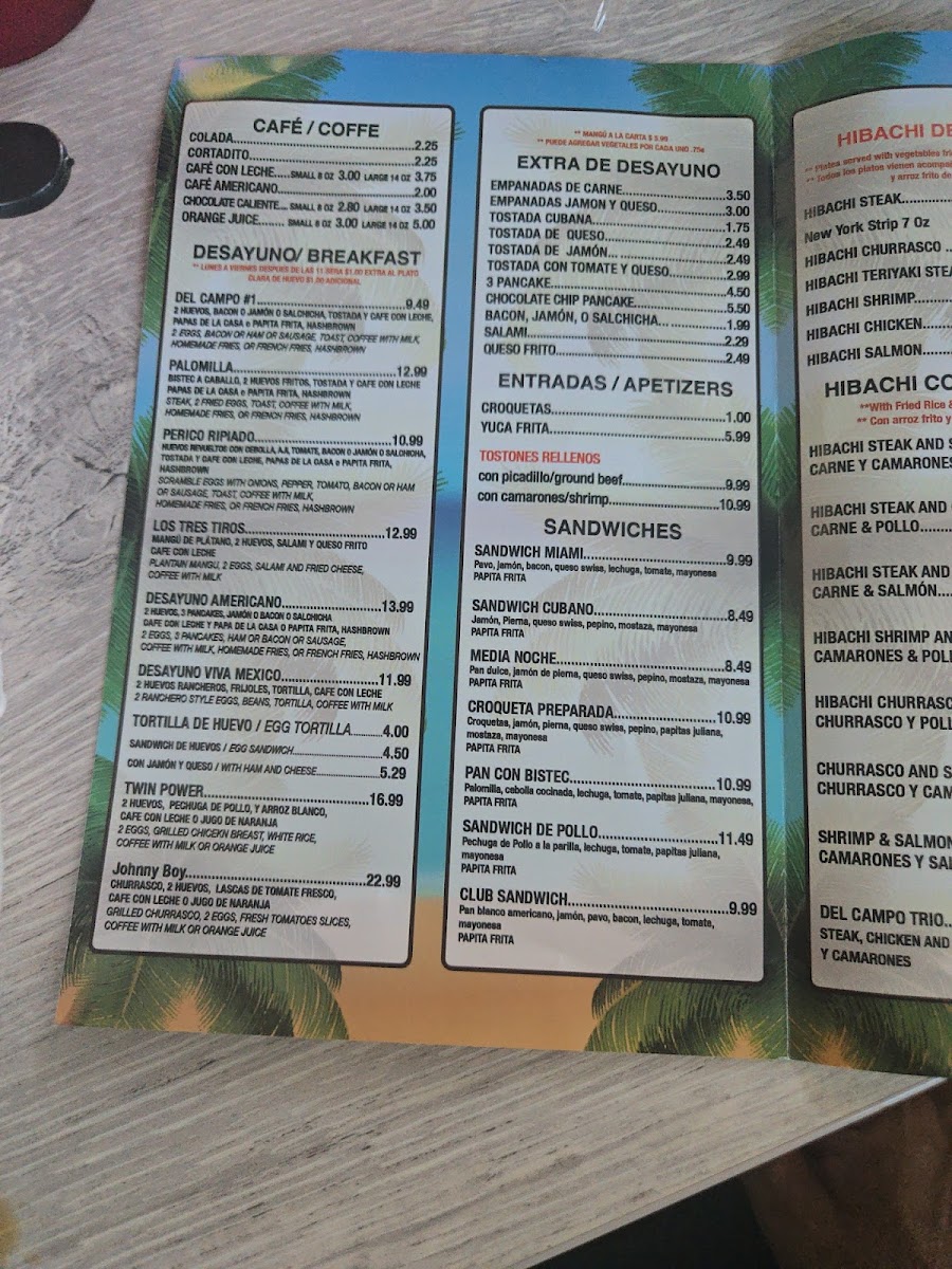 Later in the day, diners can enjoy more substantial offerings such as the Pachuca De Pollo or flavorful hibachi combinations that combine steak, chicken, and shrimp. Comforting sides like Fried Yuca or Mangu complement these dishes well, enhancing the homey vibe.